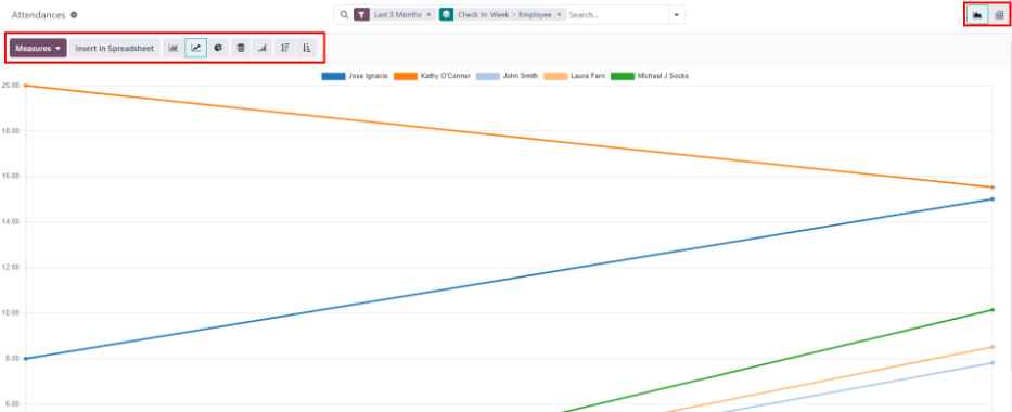 Để xem báo cáo chấm công, nhấp vào Báo cáo trong menu trên cùng. Báo cáo mặc định hiển thị thông tin chấm công của mỗi nhân viên trong 3 tháng qua, dưới dạng Biểu đồ đường.