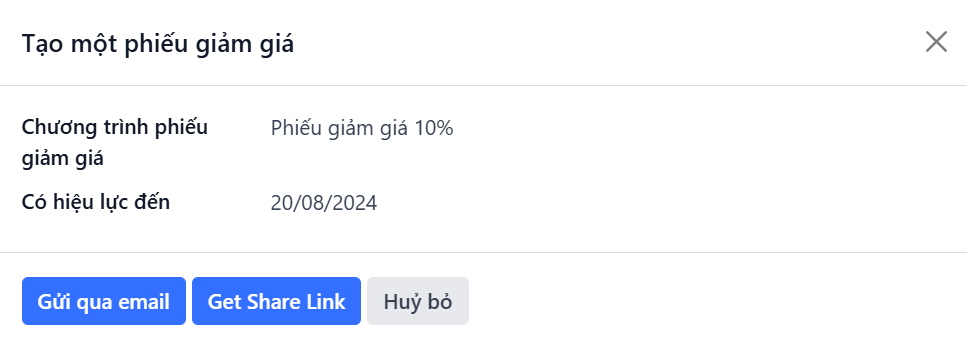 Nhấp vào Lấy Liên Kết Chia Sẻ để tạo liên kết gửi trực tiếp cho khách hàng. Thao tác này sẽ mở ra cửa sổ pop-up Chia Sẻ Phiếu Giảm Giá. Nhấp vào nút Sao Chép bên cạnh trường Liên Kết Chia Sẻ và dán kết quả vào bất kỳ liên lạc nào với khách hàng. Khi khách hàng sử dụng liên kết, mã sẽ tự động được áp dụng vào giỏ hàng của họ.