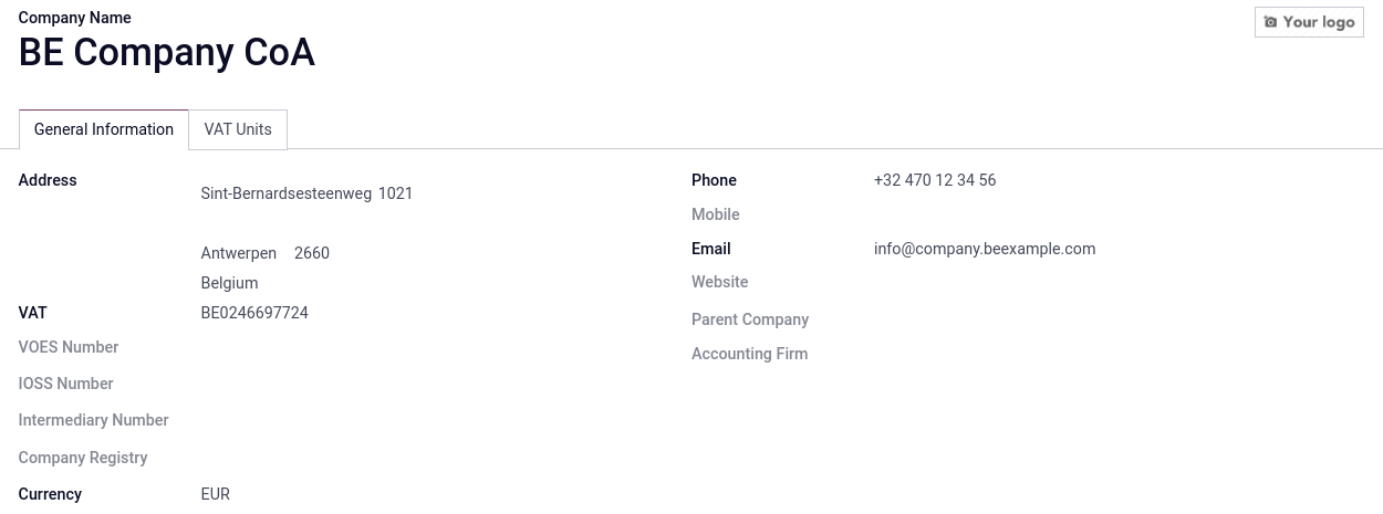To configure a VAT unit, go to , scroll down to the Companies section, and click Manage Companies. Select the company to serve the representative role, and in the General Information tab, fill in the mandatory fields for the .XML export when exporting the tax report: Company Name, Address, VAT, Tiền tệ, Phone, and Email.