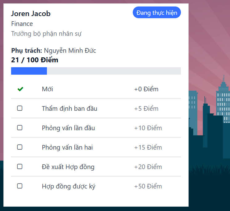 Trên mỗi thẻ giới thiệu cá nhân, dưới điểm đã kiếm được, có một thanh tiến độ hiển thị số điểm đã kiếm được so với tổng số điểm có thể kiếm được, nếu ứng viên được thuê.