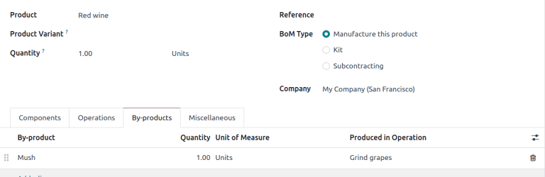 Một khi tính năng đã được kích hoạt, thêm sản phẩm phụ vào một BoM bằng cách nhấp vào tab Sản phẩm phụ. Nhấp Thêm một dòng, và điền vào Sản phẩm phụ, Số lượng, và Đơn vị đo lường. Tùy chọn, chỉ định một Sản xuất trong Hoạt động cho sản phẩm phụ.