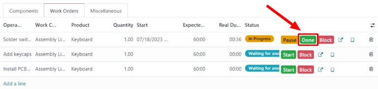 Sau khi đã chọn một |BOM|, các tab Linh kiện và Lệnh công việc sẽ tự động điền với các linh kiện và công đoạn được chỉ định trên |BOM|. Nếu cần thêm linh kiện hoặc công đoạn cho |MO| đang được cấu hình, thêm chúng vào các tab Linh kiện và Lệnh công việc bằng cách nhấp vào Thêm một dòng.