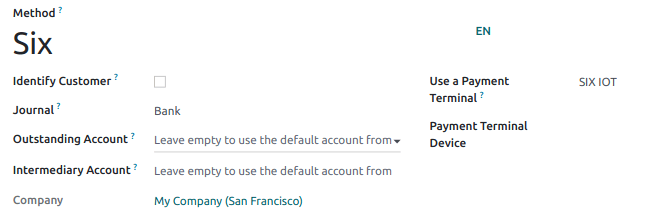 Enable the payment terminal in the application settings and create the related payment method. Set the journal type as Bank and select SIX IOT in the Use a Payment Terminal field. Then, select your terminal device in the Payment Terminal Device field.
