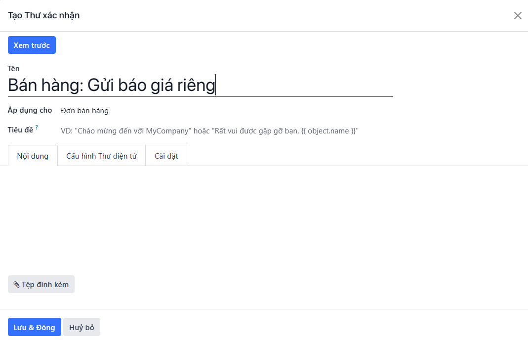 Lựa chọn Tạo và chỉnh sửa… sẽ tạo ra mẫu email, và một cửa sổ pop-up Tạo Mail Xác nhận xuất hiện, trong đó mẫu email có thể được tùy chỉnh và cấu hình ngay lập tức.